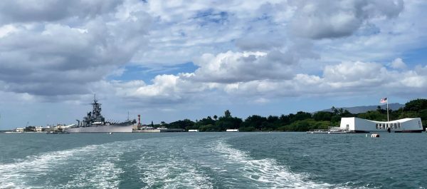 Vi har tagit oss till Pearl Harbor och har Stilla havskriget inramat framför oss. Till höger syns Arizona Memorial, som är byggt över resterna av slagskeppet som japanerna sänkte den 7 december 1941, startpunkten för kriget. Till vänster slagskeppet Missouri på vars däck Japans kapitulation undertecknades i Tokyo den 2 september 1945.