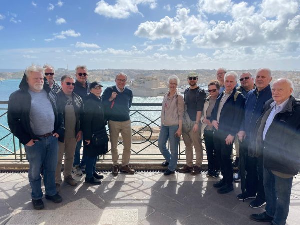 En glad grupp i Valletta med Grand Harbor och fort St Angelo i bakgrunden. Vi har studerat förhistoriska lämningar och tempel, romarna, arbaberna, normanderna, malteserriddarna, turkarnas belägring 1565, palatset som Napoleon bodde i en vecka 1798, riddarsätet som blev brittiskt guvenörspalats som blev Maltas presidentpalats, Royal Navys viktiga örlogsbas, Maltas belägring 1940-1942 då ön bombades intensivt av Luftwaffe, den stridsledningscentral varifrån invasionen av Sicilien leddes sommaren 1943 och mycket, mycket mer. Fascinerande att det ryms så mycket historia på en så liten ö!